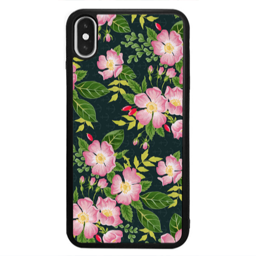 Θήκη Apple iPhone Xs Max Pink flowers green laves Black Glossy